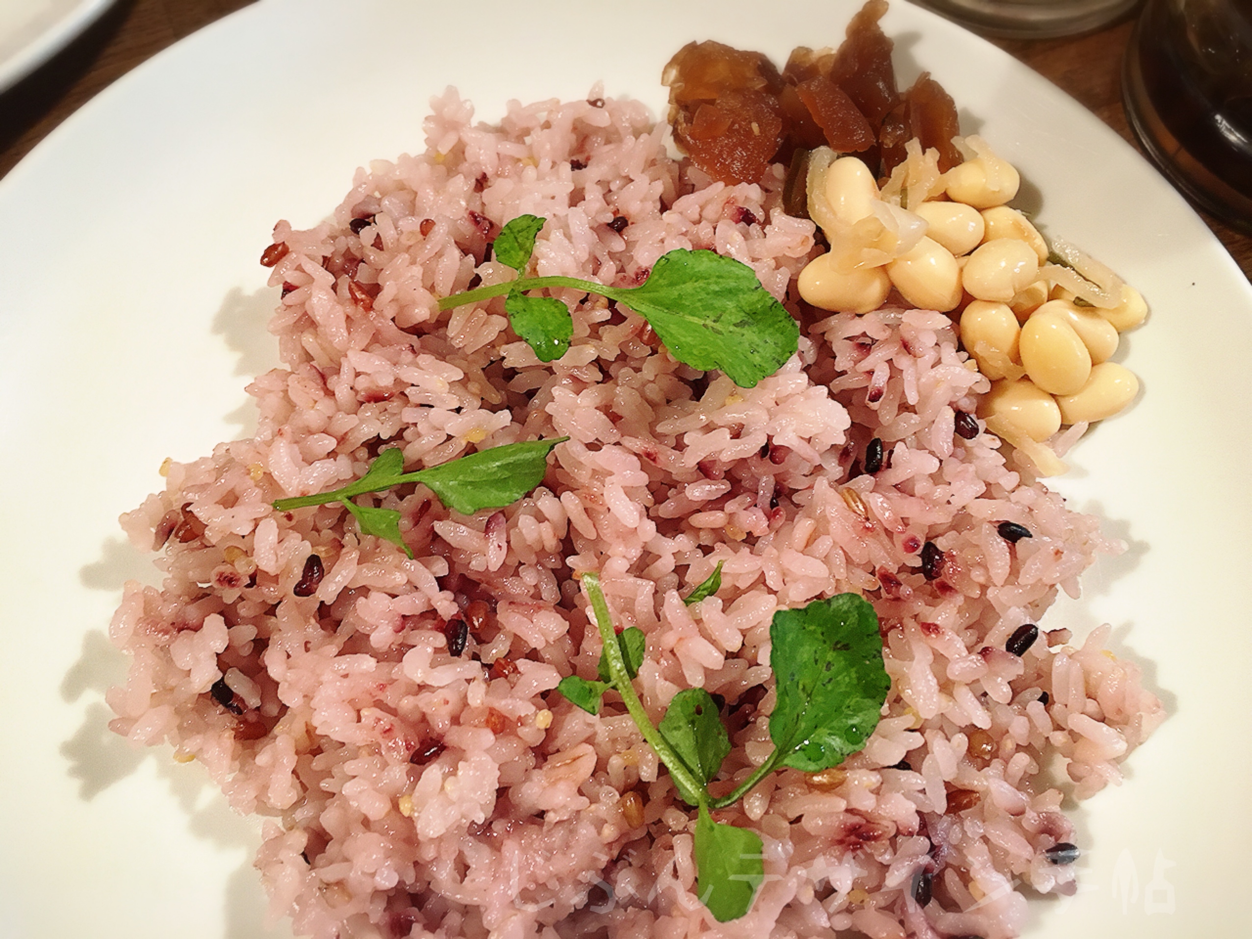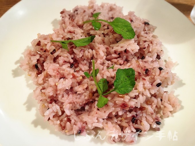 五穀米はつやつやしててトッピングの緑が効いていて色合いが綺麗!