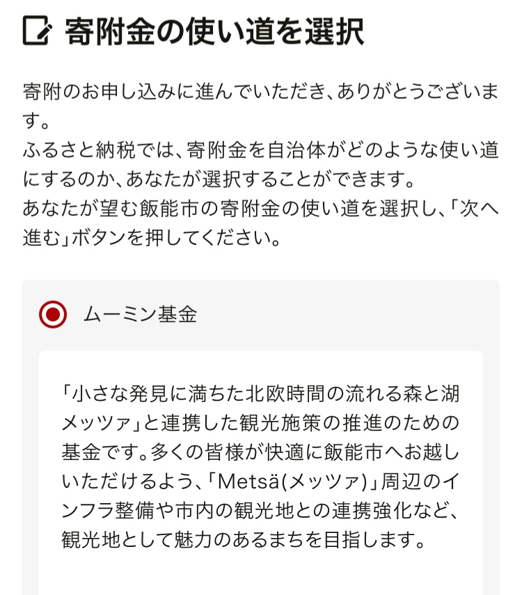 寄付金の使い道を選択「ムーミン基金」を選択する
